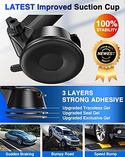 🎄🎄🎁【Super Suction Cup, Rough Road Friendly】The phone mount for car adopt 2-level locking mechanism, which is 3 times stronger than ordinary suction! The suction cup is made of 3 layers of nano sticky gel, which can prevents air gaps from forming and can withstand the temperature from -40°F to 203°F. The enhanced suction power is up to 80LBS, it holds heavy phones effortlessly. Just rinse with water to restore the stickiness.