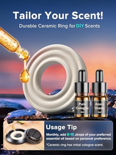 📦 Package Contents: The F21 car essential oil diffuser body is made of all-aluminum alloy (3cm high, 8cm in diameter), two 4ml essential oils (Cologne and Azure Ocean), one ceramic ring (Cologne scent), and an instruction manual. Note that the product is shrink-wrapped when new.