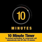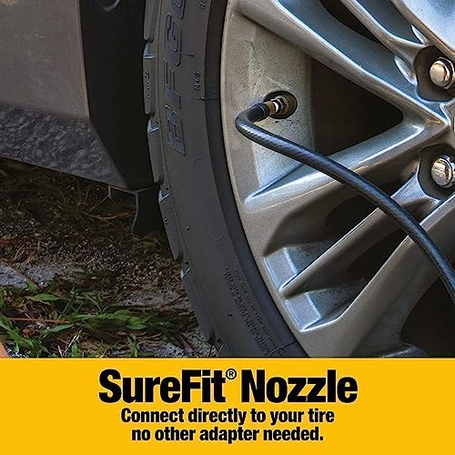 Includes an easy to use, autostop compressor for inflating tires and sports equipment; Just attach the brass-tipped SureFit nozzle to the tire’s valve stem, select desired air pressure, and the compressor will automatically shut off when finished