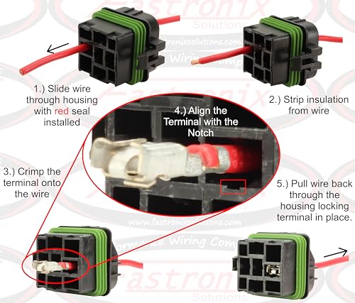 To install: Pull wire through the desired terminal, strip the insulation, crimp the correct terminal onto the wire, align the terminal and pull the terminal back into the housing.