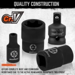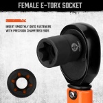 13-Piece E Torx socket set is include: E4, E5, E6, E7, E8, E10, E12, E14, E16, E18, E20, E22, E24 and 4-piece impact-grade adapter and reducer kit includes 1/4″(F) to 3/8″(M) – 3/8″(F) to 1/4″(M) – 3/8″(F) to 1/2″(M) – 1/2″(F) to 3/8″(M).