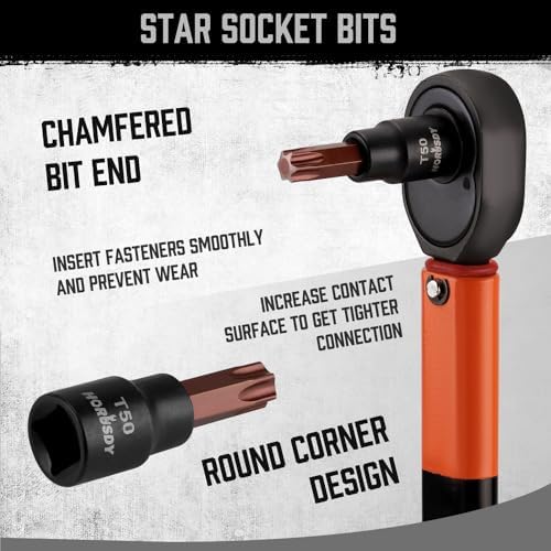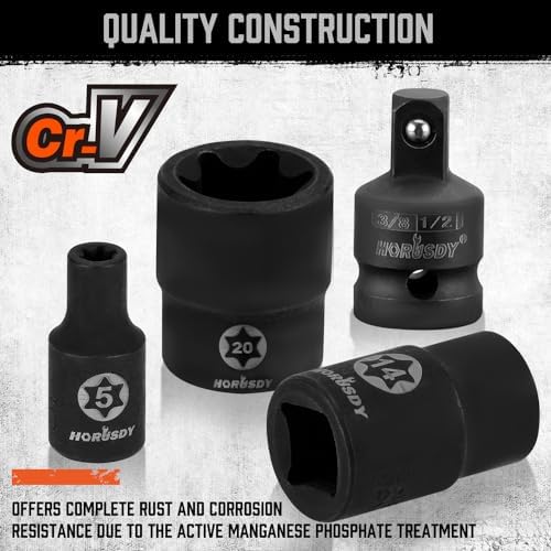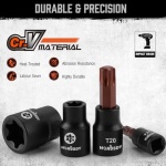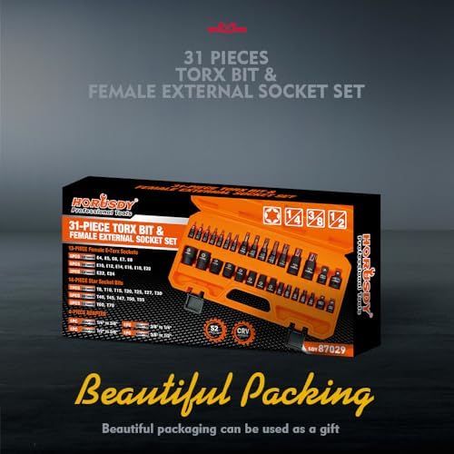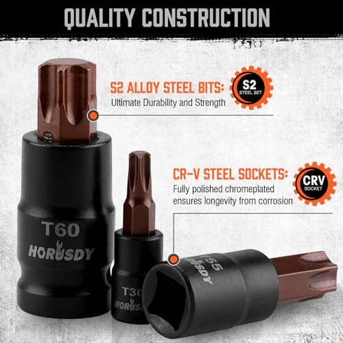 14-Piece Torx socket set is made of S2 alloy Steel and chrome vanadium steel (CR-V) which increases torque and hardness. Include Solid Star T8, T10, T15, T20, T25, T27, T30, T40, T45, T47, T50, T55, T60, T70,