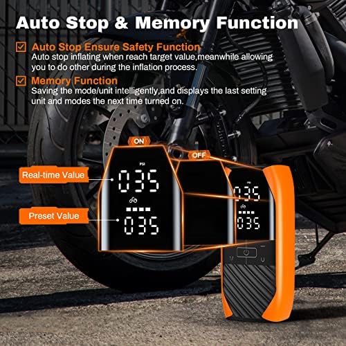 【Accurate Pressure Detecting & Auto Stop】- This tire inflator with Pressure Gauge featuring an upgraded high-precision chip,our car tire air pump provides accurate air pressure detection with an impressive precision error of only 0.05psi. Dual Large LCD digital display enables you to read the real-time pressure and the preset pressure at just a glance. The auto air tire inflator automatically stops once it reaches the preset pressure value,making it simple and safe.No need to worry about over inflating.