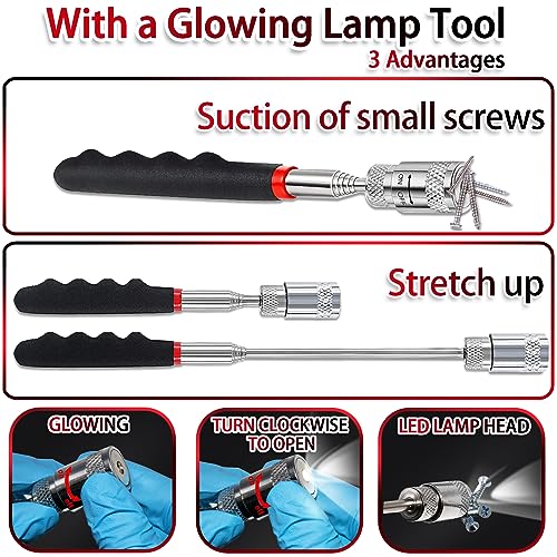 Has a telescopic magnetic tool long handle and it extends from 7” to 30”. It helps to grab objects in far to reach places for example: nuts, bolts, screws, jewelry, and other lost metal objects.