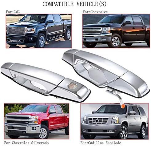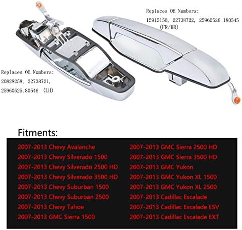 FIT—Direct fit replacement door handle:2007-2013 Chevy Silverado 1500 2500HD 3500HD | 07-13 Suburban 1500 2500 | 07-13 Tahoe Avalanche | 2007-2013 GMC Sierra 1500 2500HD 3500HD | 2007 2008 2009 2010 2011 2012 2013 Yukon, Yukon XL 1500 2500 | 07 08 09 10 11 12 13 Cadillac Escalade, Escalade ESV exterior