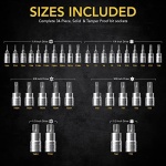 PREMIUM – 34-Piece Master Torx socket set, Features a wide range of Solid & Tamper proof Torx Bit Sockets. Crafted and Designed with superior materials for increased torque and unmatched hardness.