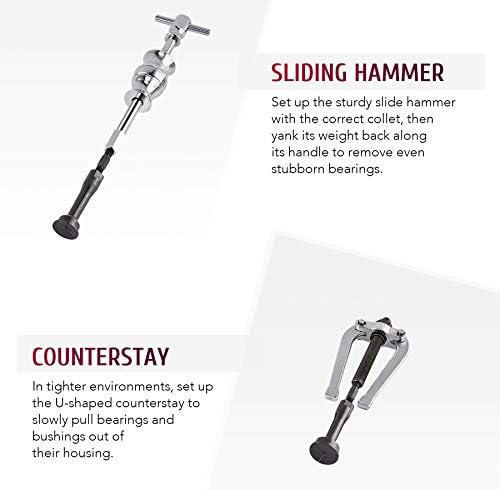 4.EASY TO USE: For most parts, just fit the appropriate collet, lock it into the inner race, and pull the slide hammer’s weight back to easily knock out the bearing or bushing; for tighter or more delicate operation, the counterstay can be slowly tightened to more carefully extract the part