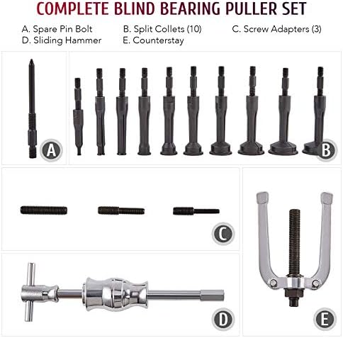 1.16-PIECE SET: This blind bearing puller set by Orion Motor Tech includes a slide hammer, counterstay puller, spare pin bolt, 3 screw adapters, and 10 split collets to get all your work done on parts from 1/4 to 2-1/3 inch diameter (6-59 mm)