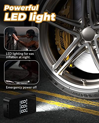 【Powerful Portable Air Compressor】With a built-in high-performance chip, this tire inflator can quickly inflate tires up to a maximum pressure of 140 PSI with an auto-stop feature to prevent over-inflation. It only takes 12 seconds to inflate a bicycle tire and 70 seconds for a 245/50 R19 car tire.