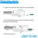 【Easy to Use】The terminal pin removal tool is easy to use, just push and pull the terminal pins with connector removal tool for removal effortlessly from the wire harness connectors without any damage. Kindly Note: Most of the wire harnesses are held in place with barb clips. You can use a tool to lift or flatten the barbs, and then gently pull out the wire ends. Pay special attention to strength and direction.