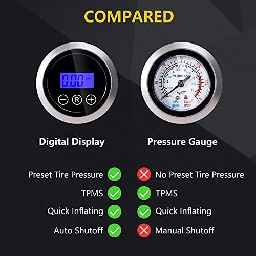 🚗【DIGITAL DISPLAY】Our car tire pump has a high-precision and bright display that is essential not only during a day, but also at night. You can also choose a desired unit of measurement for pressure: PSI, BAR, KPA or KG/CM².